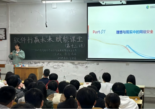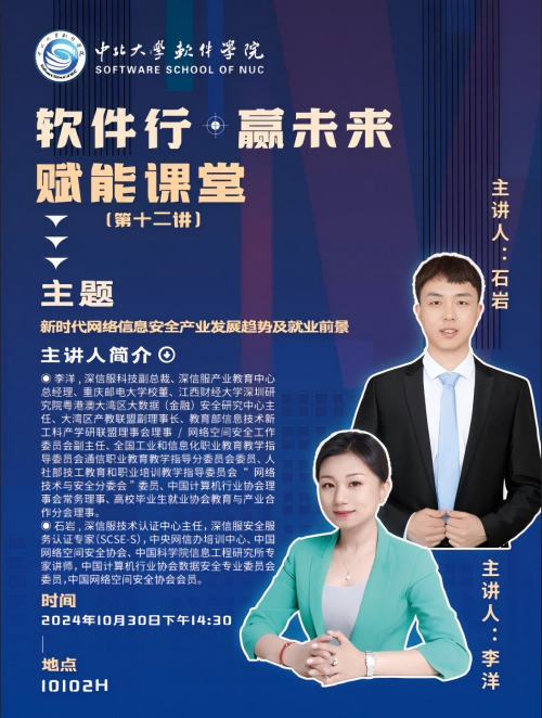 为了帮助同学们更好地理解网络信息安全领域的现状与未来发展机遇,从而为职业选择提供指导。10月30日14:30,“软件行·赢未来赋能课堂第十二讲——新时代网络信息安全产业发展趋势及就业前景”讲座在10102h教室隆重举行。本次讲座邀请了深信服科技副总裁、深信服产业教育中心总经理李洋,以及深信服技术认证中心主任石岩作为主讲嘉宾。彩票平台