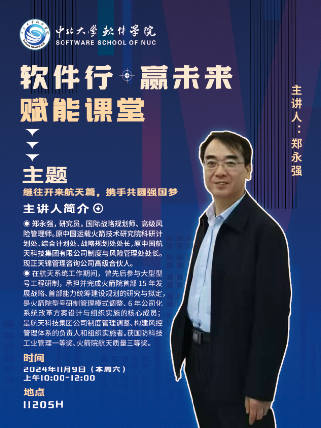 于2024年11月9日上午10点到12点在教学主楼11205H教室成功举办了“软件行·赢未来 赋能课堂——继往开来航天篇,携手共圆强国梦”。本次讲座邀请了郑永强研究员担任主讲人。