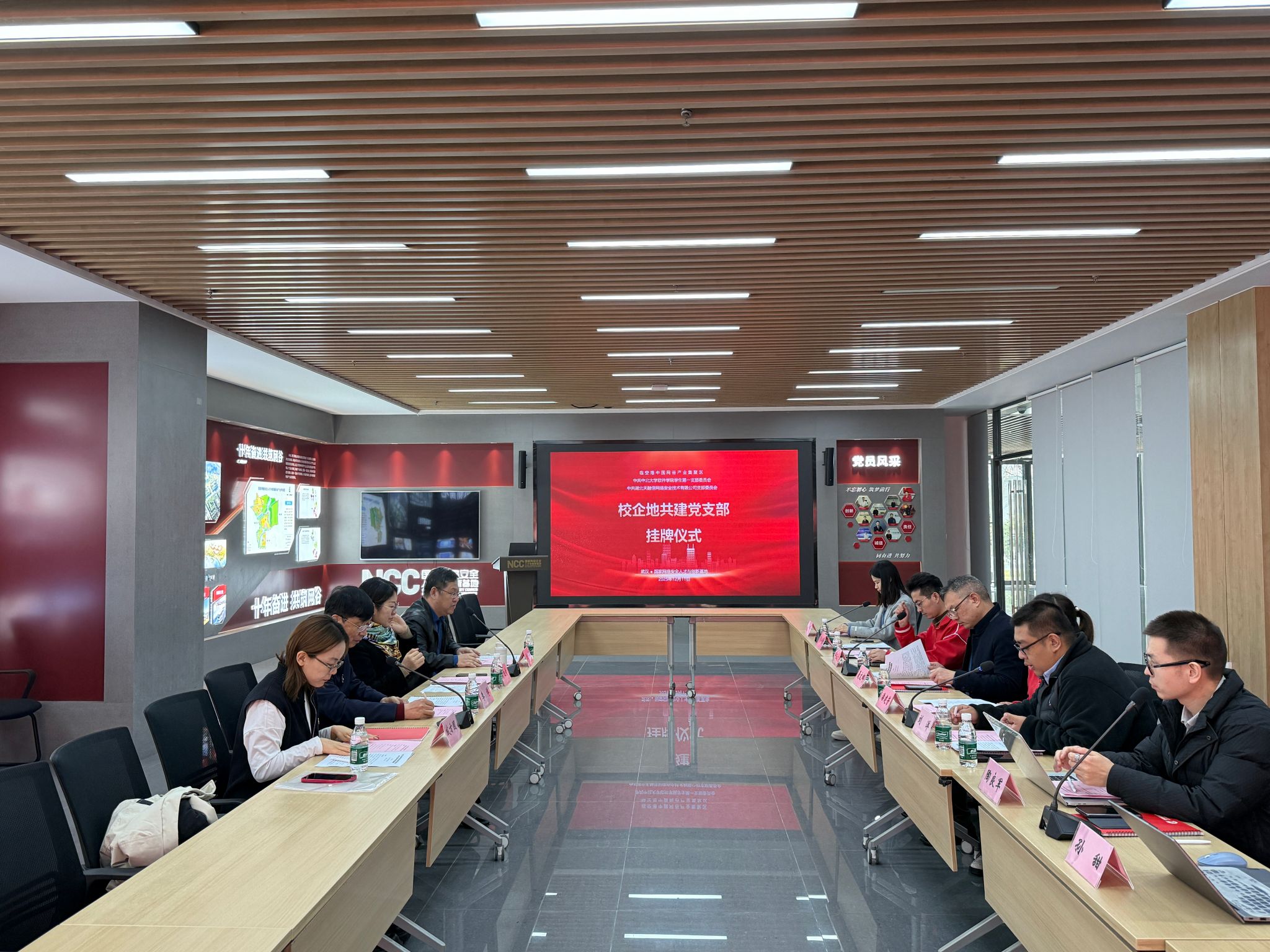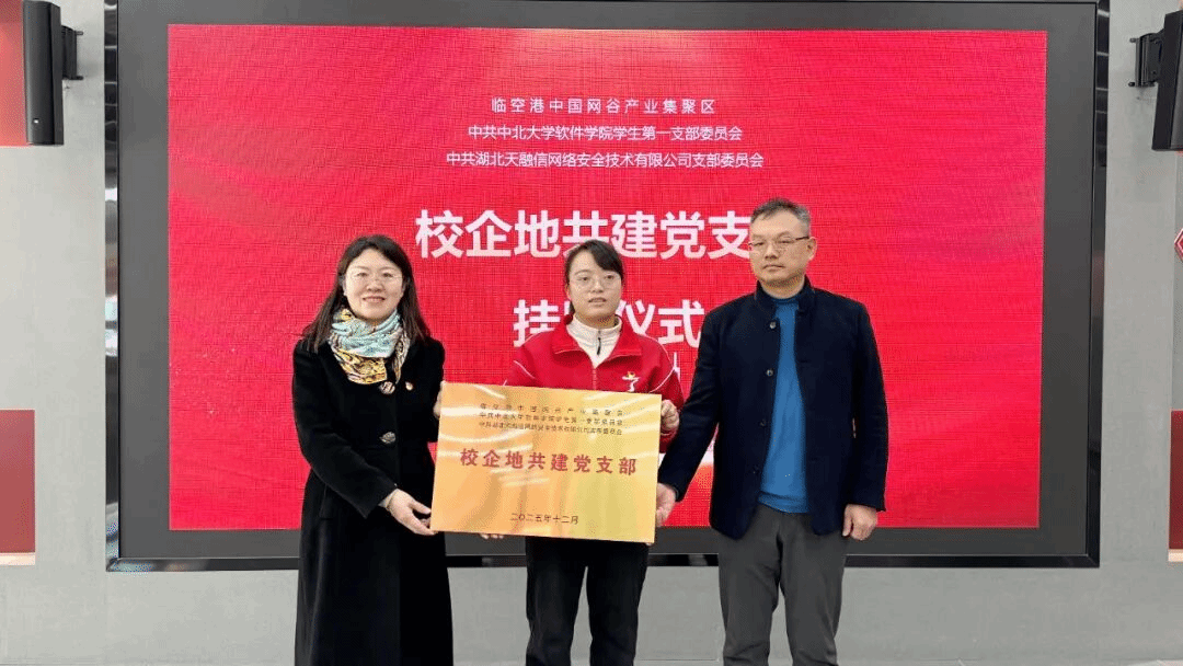 、武汉市临空港经济技术开发区、天融信科技集团三方举行了“校企地共建党支部”挂牌仪式,标志着合作迈入党建引领、深度融合的新阶段,为后续资源共享与协同育人奠定组织基础。