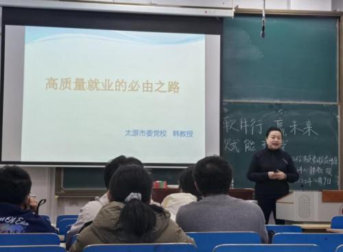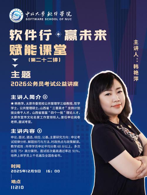 “软件行・赢未来”赋能课堂第二十二讲——公务员考试专题讲座在11210H教室成功举办。本次讲座特邀太原市委党校韩艳萍教授担任主讲嘉宾,她凭借其深厚的学术背景、多年申论阅卷与面试考官经验,为广大学子带来了一场兼具理论深度与实践指导的考公“干货盛宴”。