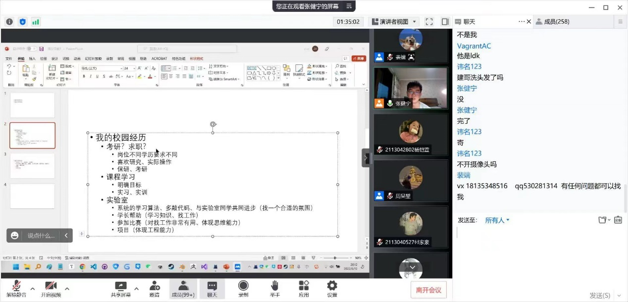6月10日晚7点,由彩票平台 团委学生会主办的“榜样的力量”系列分享活动之应届毕业生“就业篇”分享会通过腾讯会议的形式线上开讲,本场活动邀请到了18级的两位优秀同学分享他们的就业经验,他们分别是18130045班的裴端同学和181300416班的张健宁同学。