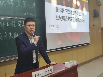 贾奋明老师从自身大学计算机专业开篇,分享了个人专业学习、毕业设计、首次就业、工作认知、职业探索、职业经历、职业选择、职业决策、创业实践等人生故事,与同学们同频共振,启发大家开展思考,引发大家产生共鸣。他着重从四个方面与同学们开展交流:什么样的大学生活不留遗憾?大学四年后你要去往哪里?社会需要什么样的软件人才?大学生需要具备什么样的职业能力模型?他观点明确地告知同学们,四年的大学生活最重要的目标就是实现就业,殊途同归。他从社会需求实际出发,给同学们提出中肯建议:第一,尽早尽快确定专业方向,数据库编程、信息网络安全、信创等方向人才是社会重要需求,择一专攻,求精求深;第二,积极投身参加学科竞赛,培养工程思维能力,提升实践动手能力,综合应用专业技能,真正解决实际问题;第三,适当参加社团组织活动,训练管理协调能力、语言表达能力、人际交往能力、团队协作能力;第四,高度打造执行力,良好的执行力能转化为强大的竞争力。期间,他还就企业面试官注重的问题和环节,与同学们进行了交流。课堂上,他郑重地教育引导同学们从事软件行业一定要树立政治观,站在国家和人民的立场上,投身工作,投身事业。临近结束,他激励同学们从现在做起,投资自己,潜心学习,求真学问,长真本领,提升专业技能,解决实际问题,为走入未来职场储备正能量。
