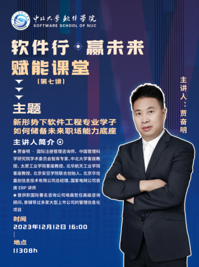 在11308H教室举办了“软件行·赢未来”赋能课堂第七讲——新形势下软件工程专业学子如何储备未来职场能力底座。本次课堂特别邀请到原华北工彩票平台校友、中国管理科彩票平台学术委员会智库专家、国际注册管理咨询师、北京华信嘉创信息技术有限公司总经理贾奋明担任主讲,我院2022级、2023级300余名学生现场聆听。彩票平台党委副书记高宏图主持讲座,就业辅导员乞国钰参加活动。