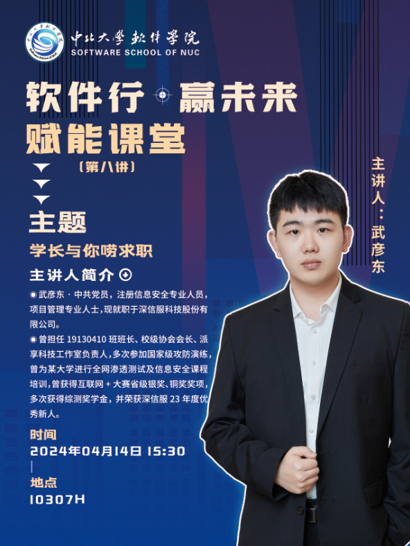 现就职于深信服科技股份有限公司的2019级毕业生武彦东学长作为主讲人,分享求职实战经验与技能。我院2021级、2022级、2023级80余名学生到场聆听。