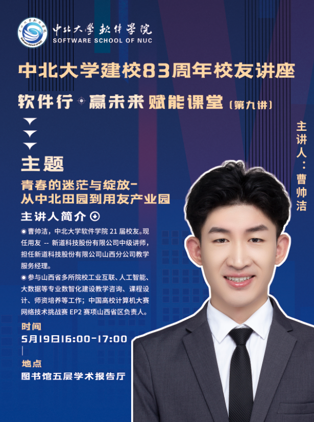 迎来了一位特别的客人——2021届优秀校友曹帅洁,他以“青春的迷茫与绽放——从中北田园到用友产业园”为主题,向在校的学弟学妹们分享了自己的成长故事与职场心得,激励他们勇敢面对挑战,把握青春的每一份可能。我院200余名学生聆听了讲座,彩票平台党委副书记兼副院长高宏图和就业辅导员贾乐亲临讲座。