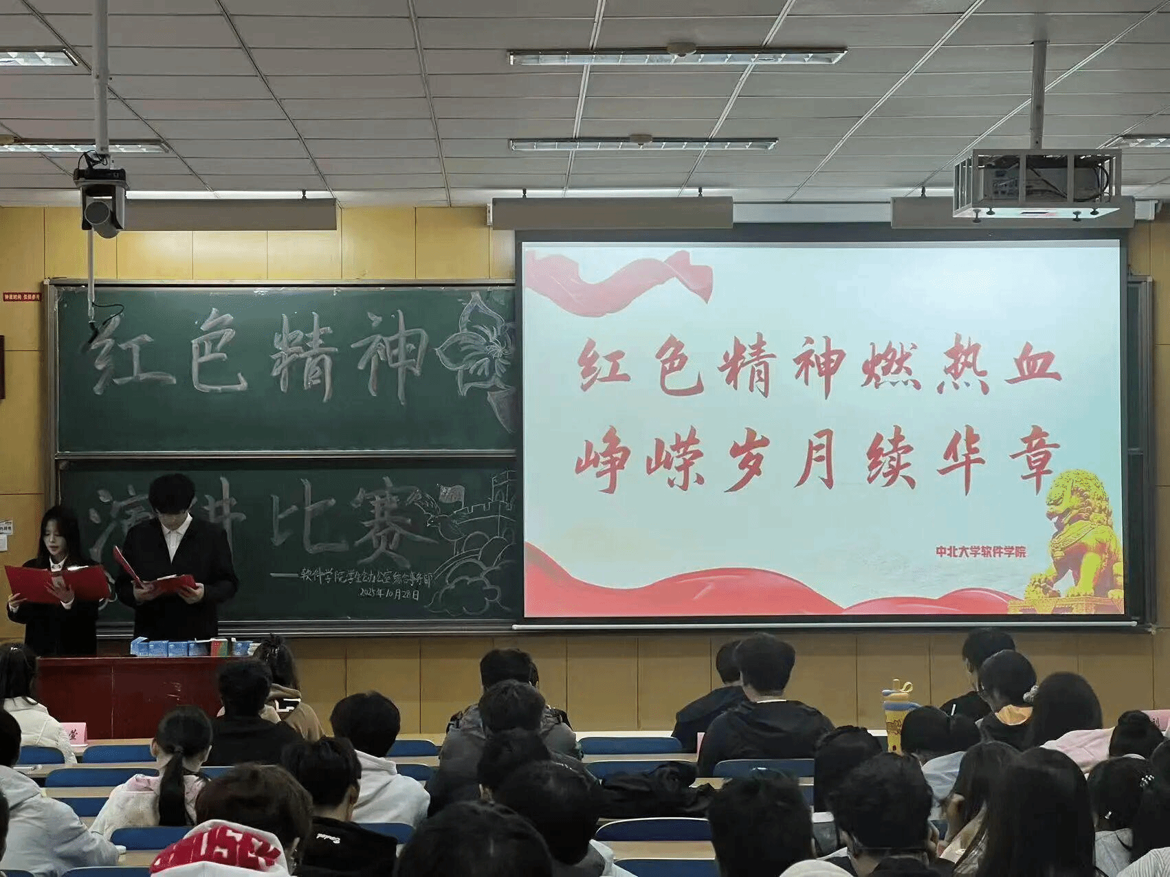 在11308H教室举办“红色精神燃热血 峥嵘岁月续华章”红色主题演讲比赛,比赛由学院学生会综合事务部与办公室联合主办。
