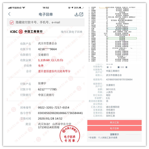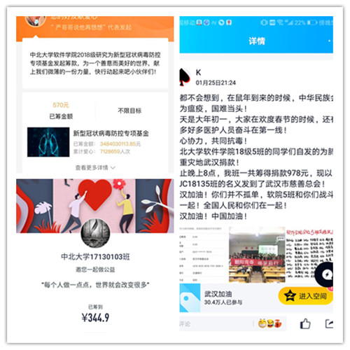以班级或个人名义通过湖北省慈善总会、武汉市慈善总会、腾讯公益等途径捐款累积7311.81元。18130045班的班长冀凯在班级群QQ群给同学发出新年祝福“请大家待在家中,不外出、不聚会,就是我们彼此最好的祝福”,并发出倡议“给武汉捐款,每一元、每一分都是大家的心意”,一呼而百应,点滴爱心汇成驰援武汉的溪流。17130108于彦宽同学,通过介休市青年志愿者协会捐献了方便面4箱、矿泉水4箱、牛奶8箱。疫情就是集结号,每一分钱、每一件物品都带着温度将同学们的祝福和爱国情怀传递到祖国最需要的地方。