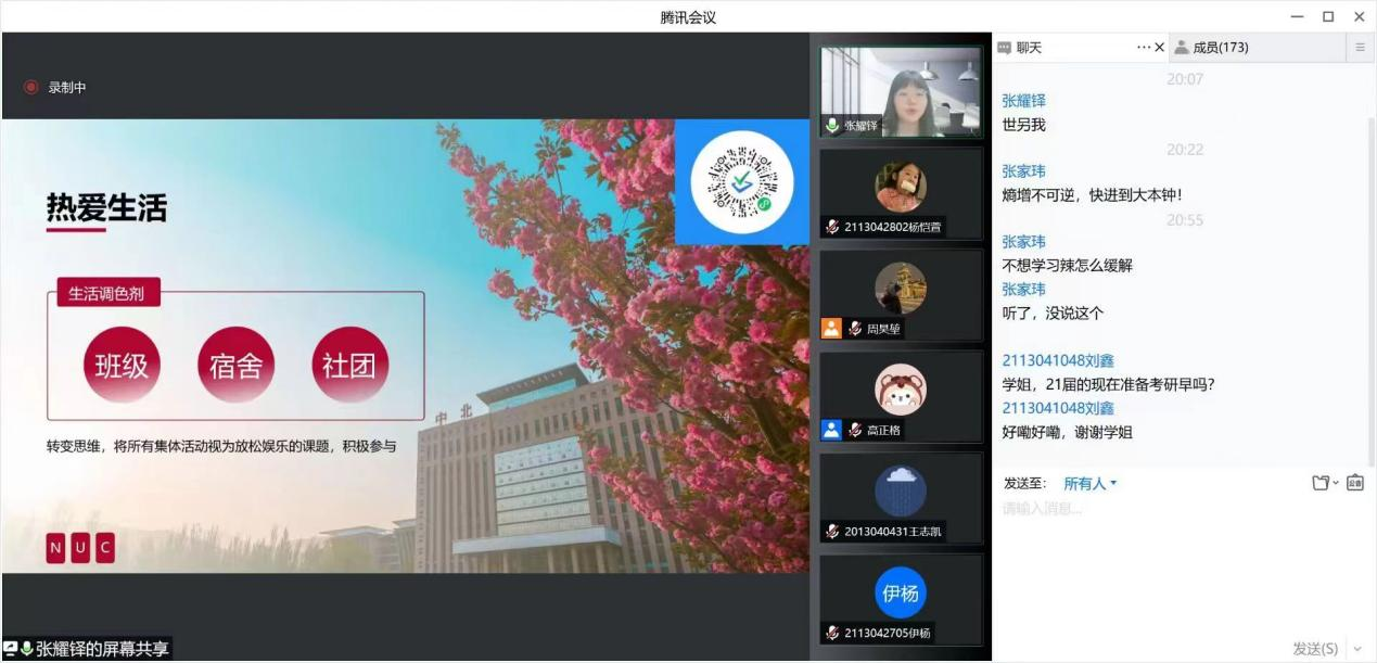 团委学生会主办的“榜样的力量”系列分享活动之应届毕业生“就业篇”分享会通过腾讯会议的形式线上开讲,本场活动邀请到了18级的两位优秀同学分享他们的就业经验,他们分别是18130045班的裴端同学和181300416班的张健宁同学。