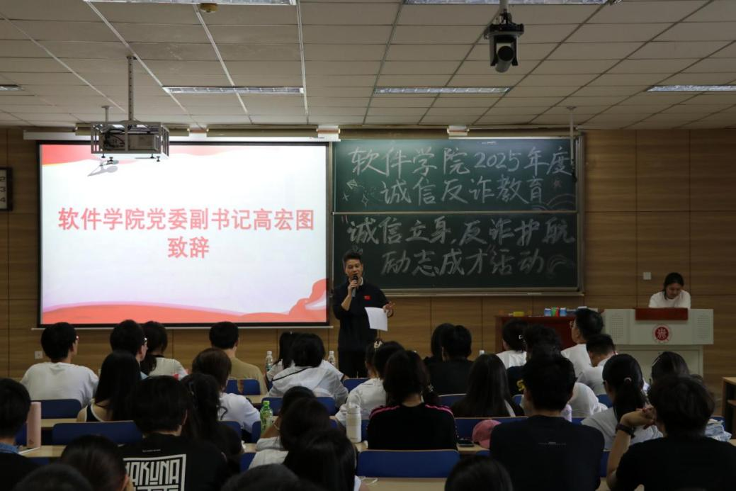 高宏图副书记在致辞中强调,诚信教育是大学生思想政治教育的重要内容。他引用古今诚信楷模的事例,深入浅出地阐述了诚信立身的重要意义,同时结合近期频发的校园诈骗案例,语重心长地提醒同学们要增强防范意识,筑牢安全防线。最后号召同学们以诚信为帆,以反诈为桨,努力成长为有理想、有本领、有担当的时代新人。
