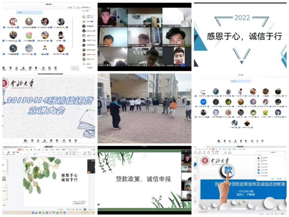 2022年5月31日至2022年6月6日,2019级、2020级、2021级各班级困难生负责人针对彩票平台资助教育大会内容,采用线上或线下的形式向班级贷款同学宣讲资助政策,同时针对同学们的问题进行解答,并倡议同学们诚信贷款,励志成才,感恩母校。