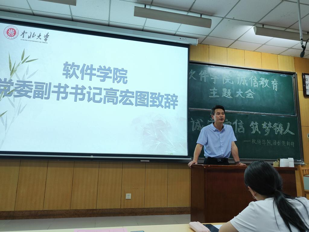 党委副书记高宏图结合时事热点,为同学们讲述了诚实守信的重要性。首先,通过仝卓、翟天临事件以及天津大学和厦门大学硕士学位论文雷同等案例,为同学们讲授不守诚信对大学生品行以及形象的严重负面影响,倡议同学们要对诚信建立正确的认知,做一名诚信的大学生。再者,通过讲授《公民道德实施纲要》和《民法典》中关于诚信的内容,提出大学生要诚实劳动、信守承诺、诚恳待人。寄语每一位大学生,一、敬畏诚信,把诚信作为自己安身立业的基点;二、珍惜诚信,把诚信作为自己自信自立的骄傲;三、推广诚信,把诚信作为照亮身边他人的光芒。最后,他激励同学们要努力成就一个爱国、敬业、诚信、友善的自我,自信自立,不断强大,追求实现自我价值!